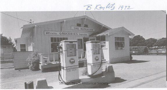 A Xerox copy of a black and white photograph taken by Barbara Kayfetz when she lived in Stinson Beach, upstairs of Sunshine Gallery, now Village Shop, across from the Village Green I, in 1972. It shows The Bangalow grocery store originally built about 1915 by William Lawrence and operated by his son-in-low, Jim Meyers and his family since 1919. The photo shows the building with 2 gasoline pumps, Rine Premium and Rine Regular. The sign 'Bangalow is on the center of building under the roof and the second sign, 'Fruits GROCERIES Vegetables' is nailed above the windows and the double doors. The right hand side door is open. The building has 3 steps to go up to its porch-deck . Signed B. Kayfetz 1972 above the print.Collection
