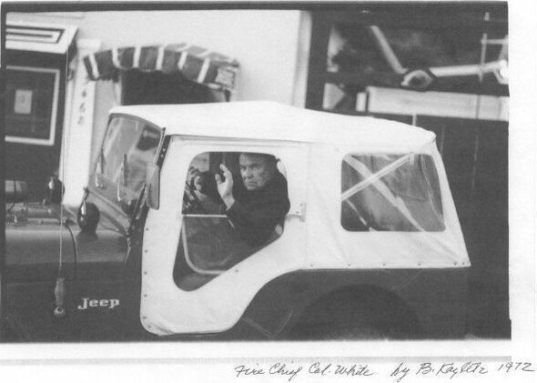 A Xerox copy of a black and white photo of Col. George White, who was the Fire Chief in 1972 when this photograph was taken by Barbara Kayfetz. Col. White is waving his left hand from the window of his jeep (red) with canvas top. The Jeep looks like it is just passing in front of the present real estate office (2466 Shoreline Highway?) next to the Sand Dollar restaurant. Signed "Fire Chief Col White by B. Kayfetz 1972" at the bottom of the photo,Collection