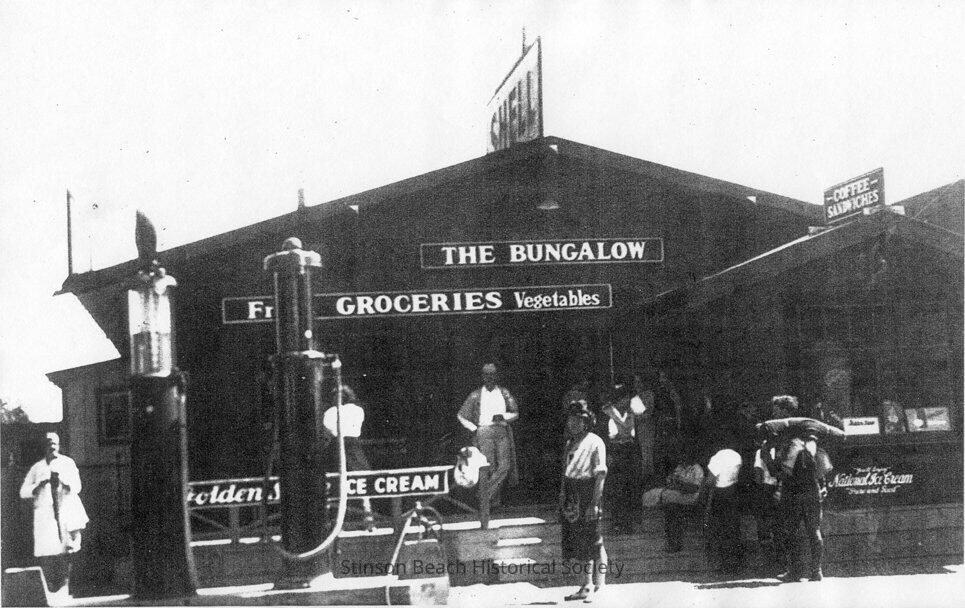 A photograph of the Bungalow grocery store and gasoline station was printed in Xerox and transfered into a digital photo by the staff. The original photograph can be found on the wall of the Breakers Restaurant in the Stinson Beach. The restaurant's original name was the Bungalow. The original owner of the store, James Mayers, is standing on the deck in front of the door. Three others who might been employees are also standing looking at the camera. Total of 11 people, including 4 hikers with their bed-rolls, are making a line to purchase sandwiches and coffee which was sold from the window on the right side of the photo. The building front has 2 signs: The Bungalow and Food Groceries Vegetables. The building has Shell (gasoline) sign on top of the roof and 2 gasoline pumps are standing in front of the building.Collection