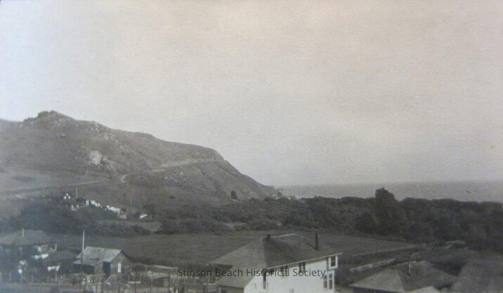 A view from the house built by Lyman Beacher DeCamp, looking toward the highway to Mill Valley and Pacific Ocean. The Airey Store's second floor and the roof is shown on the center front. Shows Sea Beach Hotel on the town. The Chevalier's house (1917) is already built in the distance. the Willows and the ocean are also shownCollection