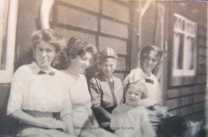 5 people are in the photo gathered on the porch of the house, 2011-106-01, facing east. The lady who is sitting at very front is Louise DeCamp Scoffield, the first postmaster of Stinson Beach. Rest are unknown.Collection