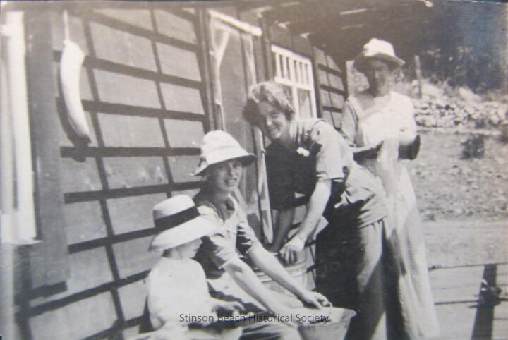 A black and white photograph of four members of Lyman DeCamp family sitting on the porch facing east. The lady who is standing and leaning over in the center of the photograph is Clara Nunn DeCamp, the wife of Daniel DeCamp (second son of Lyman Beacher). Two girls in sun hats sit in front of her and an older woman in a t-shirt and a long apron with a camp hat is standing to the back with a towel and a bowl in her hands. A set of windows and a door are on the wooden wall of the house. A crescent shaped object is hanging on the forward side of the wall.Collection