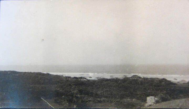 A black and white photograph of a view toward beach from hills. There are a prominent squarish rock to right and a fence line (Possibly the marker between Rancho Bolinas and Rancho Sausalito) to left but it is hard to identify exactly where it is aiming. The beach front is covered by vegetation, possibly willows.Collection