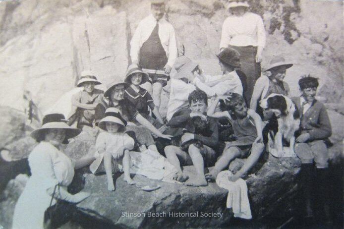 A black and white photograph of Lyman Beacher DeCamp family on top of the large rock at the southern end of the beach. Altogether, there are 13 people and one dog. An older couple in the back and 4 boys, 4 young girls, and 3 ladies comprise the family.Collection