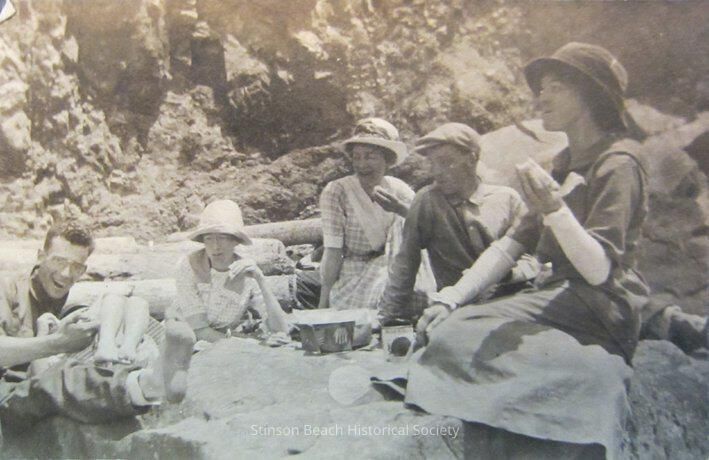 A photograph of DeCamp family picnic at the beach. There are 2 men and 3 women sitting on the beach having picnic. The man on the left with eyeglasses is Jack Decamp and the man wearing a cap is Daniel. The woman on his right is Clara Nunn. Daniel and Clara are the parents of Martha DeCamp Densmoore.Collection