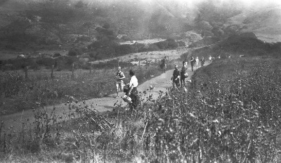 A black and white photograph of runners coming down the hill near Stinson Breach. The fog is rising on the distant hills. The trail runs along the ranch fence of possibly the White Gate Ranch, also the division of Rancho Bolinas and Rancho Sausalito. 4 or 5 runners in white and several onlookers are on the trail.Collection