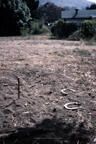 The site of the Village Green 1 before its installation. The field is filled with dead grasses and dirt. On its foreground a stake for the game of horse shoe throwing is standing with 2 horse shoes. On its back ground the small white house with blue trim on Arenal Street is shown.Collection