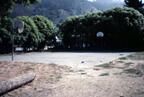 A color slide of the view of the basket ball court from the Village Green 1 site before its installation looking toward Highway 1. Shows the dirt field with a large log sitting in front and the trees behind the court and 2 hoops.Collection