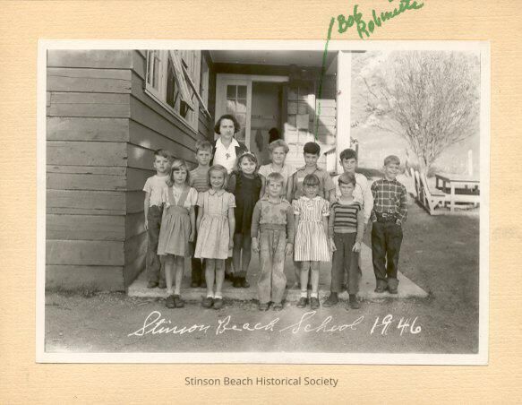 Black & White photograph of the 1946 class of the Stinson Beach School. 12 children in two rows and their teacher. Identified children are as follows: 3rd from the left in the front row is Barbara Smith; first on the right in the front row is Tom O'Gorman; third from the right in the back row is Bob Robinetti. The teacher is Louise Airey.Collection