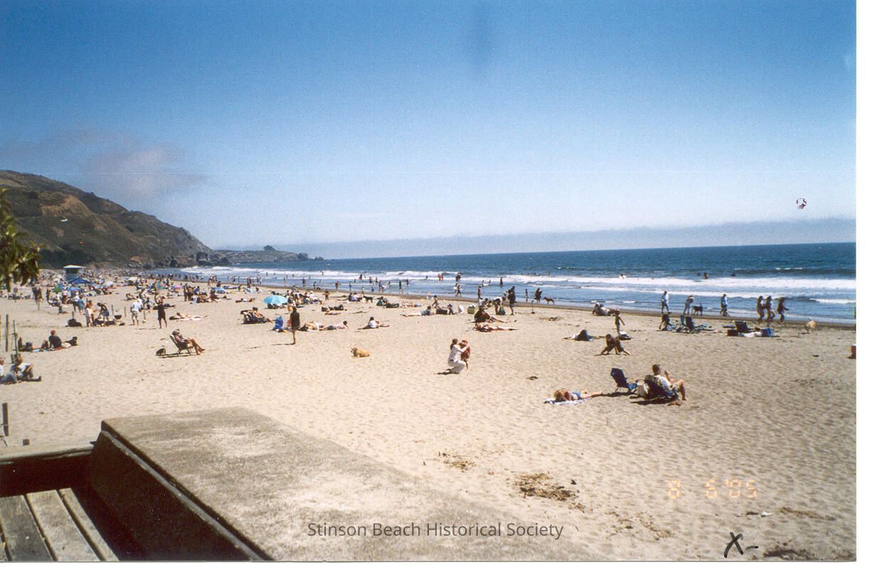 Color photo of Stinson Beach on a lovely sunny day with many sunbathers. The lifeguard shack is in the left middle of the photo. You are looking toward south with the cliffs in the rear of the photo.Collection