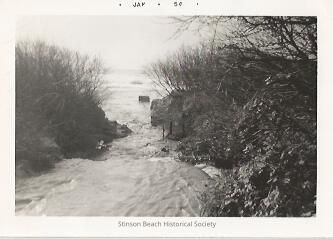 Black and white photograph with date on the top edge - January 1956. Photo of flood waters washing past trees and mud to the ocean.Collection