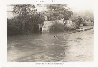Black and white photograph of the Sea Downs parking lot totally flooded. There is a date of the flood at the top edge of the photo - January 1956. The photo shows the back of the Sea Downs Hotel in the upper half of the photo with a small fence, bushes and trees. The balance of the photo is swirling flood waters covering the parking lot behind the hotel.Collection