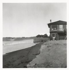 This is a black and white photograph of a two storey house. There is a small window on the ground floor and a larger picture window on the upper floor and a door with a small landing. The house is on the right side of the photo with the sea on the left. The sea is almost up to the house and the retaining wall of the house behind (left of the Deissler House in the photo)is jutting out into the water. .Collection
