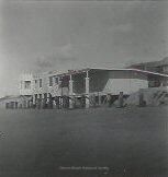 A black and white photo of a single storey building on pilings. The right side of the house is recessed with an overhang. The left side of the building juts out into a single storey "tower". This feature together with a crenelated roof line earned it it's nickname 'The Castle'.Collection