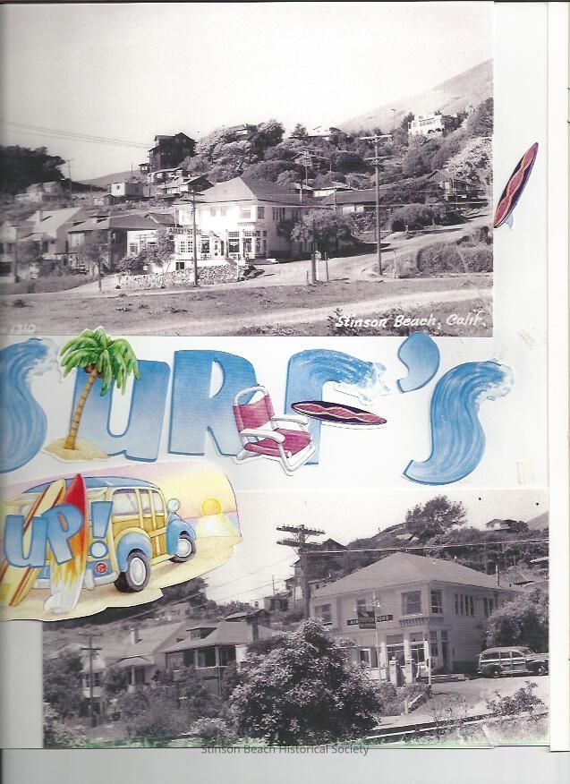 This page titled Surf with blue surf motif has 2 photographs of the Airey Store. Both are postcards and has Stinson Beach written in white at the lower right. The bottom card is similar to 1993-205A but it has more surrounding houses along the highway. The top one is similar to the bottom but has more houses on the hill which were obscured by the sticker with the old station wagon with the surf board on the bottom photo.Collection