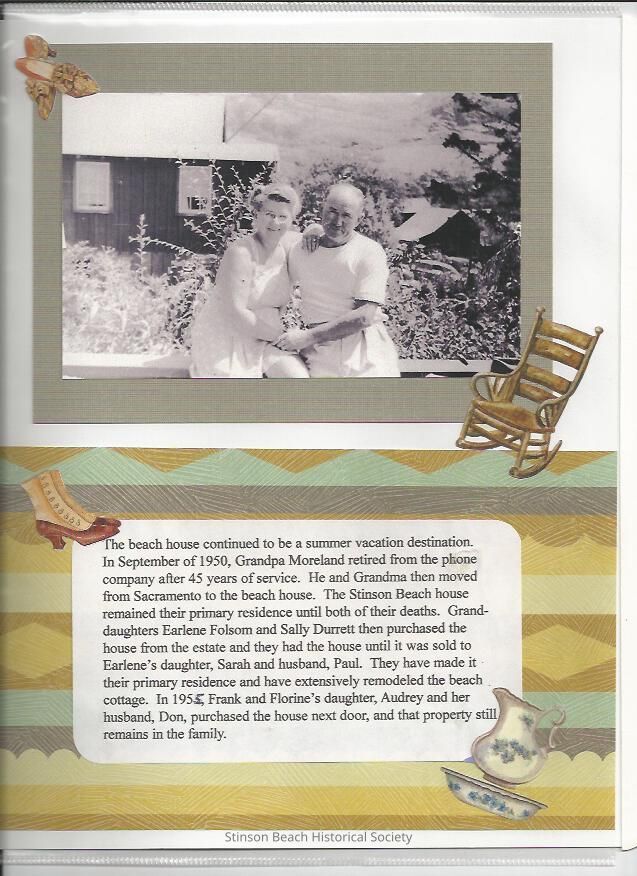 This page, decorated by two pair of Victorian lady's shoes, a locking chair and a porcelain pitcher and water basin has a black and white photograph of Frank and Florine Moreland setting on the deck railing (of their cottage?) holding hands. The back ground shows hills beyond and houses near by. Both are wearing summer attires. The caption in the lower part of the page tells the couple retired to their cottage since 1950 until death of both. The grand daughters Earlene Folsom and Sally Durrett then purchased the cottage until it was sold to Earlen's daughter, Sarah and husband, Paul in 2010.Collection