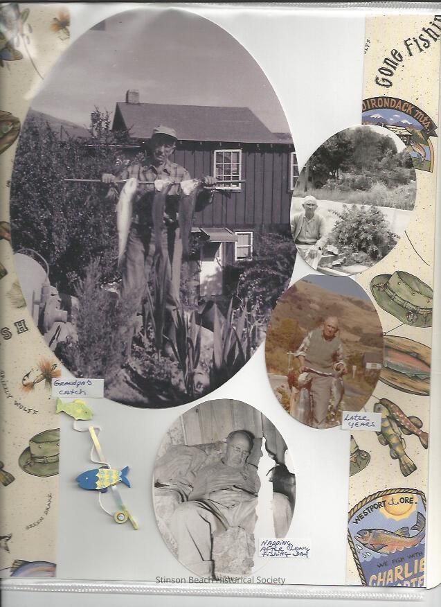 This page shows 4 photograph of Frank Moreland showing the catch of the day and napping after a long fishing day. The lager photo in the center has him holding 3 large fish on a stick and to the right there is another photo of him with 2 large salmon. The fishing motif decorate around the photos.Collection