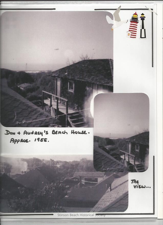 This page shows 3 black and white photographs of Don and Audrey's Beach House and its view. Audrey is a daughter of Frank and Florine. They bought the house next to Moreland's in 1955. See note on 2012-109-07 and 11. Too and the right photograph shows shingle roofed house with steps leading to the entry door. You can see the beach and ocean beyond. The bottom photo shows the view from the house looking toward south showing the beach, roof of the store and the Chevron Station Garage and other roofs and the beach beyond.Collection