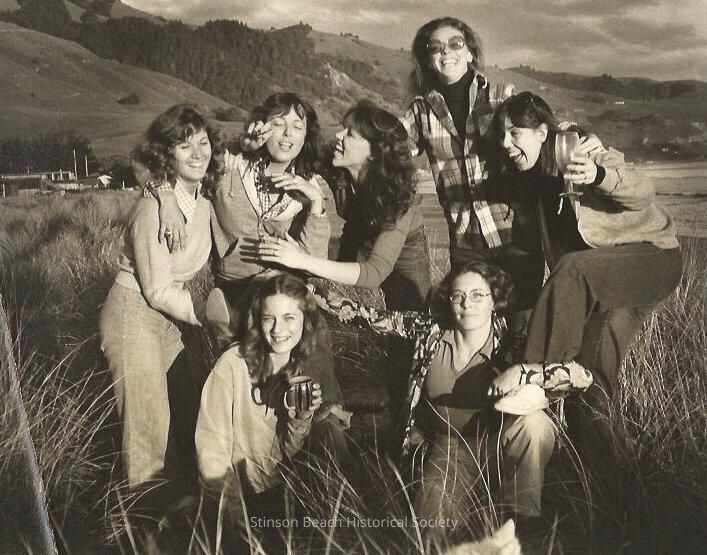 This black and white photograph is of seven young women posing in the dune grass with hills and the ocean in the background. They are laughing and cutting up. They are identified as follows: back row left to right: Diane Levy, Carla Owston, "Red' Deb, Loraine Miller and far right unknown; front row left to right: Natalie Nachtman, Suzanne Duerden White.Collection