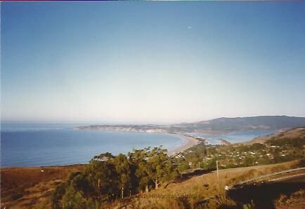This color photograph is a panorama of Bolinas Bay. It shows a stand of Eucalyptus in the foreground hillside and the houses of Stinson Beach town farther back. The sweep of Bolinas Bay is in the background bounded by the sandspit and Bolinas Mesa. Bolinas Lagoon is visible, full of water (at high tide) to the right of the sandspit.Collection