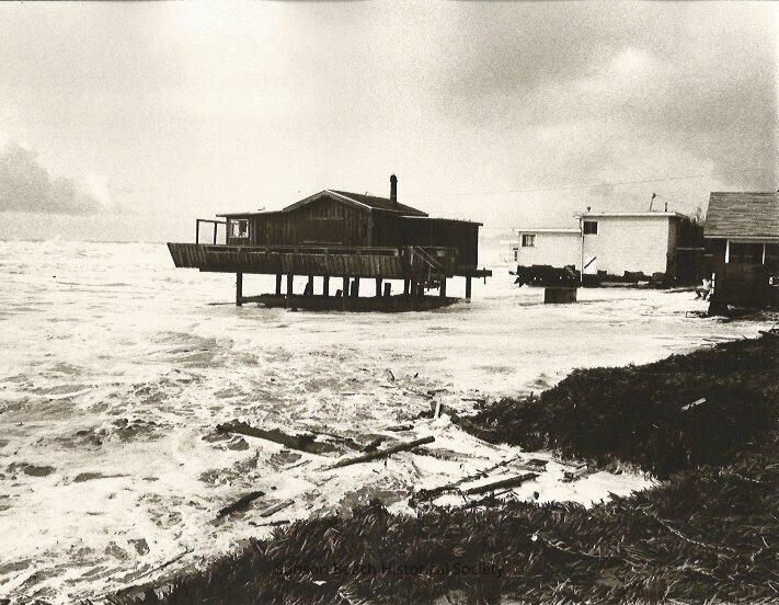 The Kugelgen house stands on its pilings with the ocean swirling around it. Two other houses can be seen beyond and to the right of it. The ocean is bringing ashore pieces of wood and other debris onto a mound of iceplant growing onshore.Collection