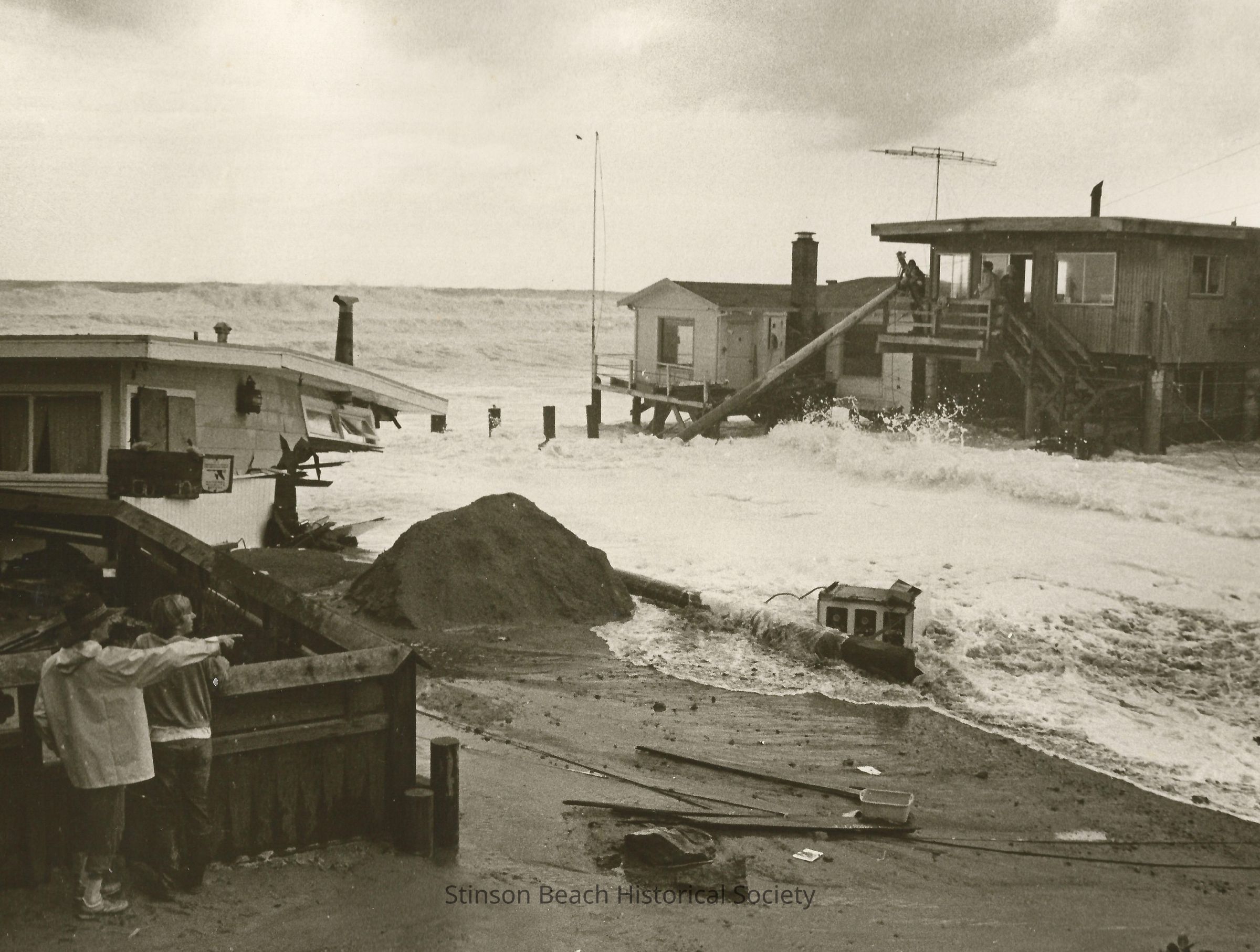 Syd Boyle in cap and rain jacket stands beside his collapsed house after the storm of 82-83. The sand has turned into gravel. A couple of seabirds sit atop a broken sign attached to the side of the house where windows have been boarded up.Collection