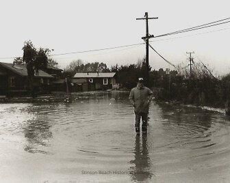 Phil O'Brien stands knee deep in water on Calle del Arroyo, where the ocean meets the creek. He is wearing a cap, rainjacket and boots. Two houses on the left side of the road.Collection
