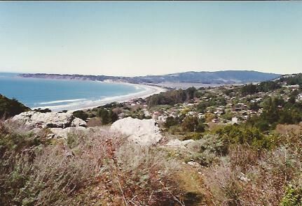 In this color photograph we see shrubs and boulders in the foreground, the hillside portion of Stinson Beach in the midground and in the background the sweep of Bolinas Bay with Bolinas Point and Bolinas Ridge on the horizonCollection