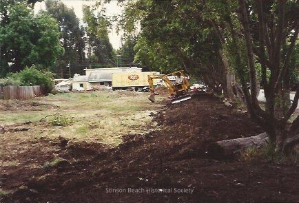 A color photograph of the Village Green I lot looking southwest toward the ocean. Piles of topsoil are under the trees to the right and in the foreground;. There is a tractor beside the topsoil and the Parkside Cafe is visible beyond the lot.Collection