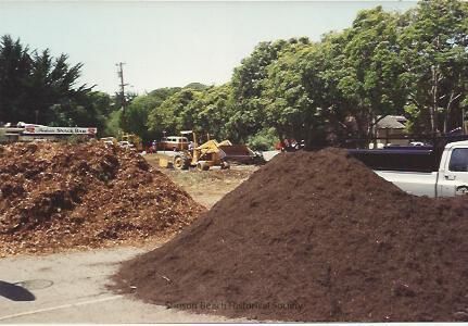In this color photo we see a pile of topsoil and a pile of mulch both destined for the plant beds in the Village Green I. There are a white pickup truck. a tractor and the Roof of the Parkside Cafe visible behind the mounds.Collection