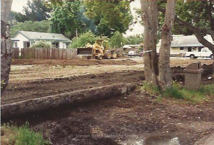 This is a color photo of the Calle del Mar (northwest) boundary of the Village Green I. The lot has been leveled and siding has been put in place to hold topsoil for the plantings. A tractor- shovel is in the background alongside a fence with a cottage behind it.Collection