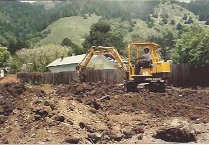 This is a color photograph of a yellow tractor/shovel digging up the rocky soil on the lot which is to become Village Green I. There is a fence, a cottage and the green hills in the background.Collection