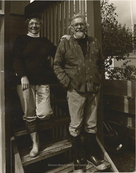 Albertine White Reuter & Don Reuter stand on the steps of a neighbor's house during a break in the storm which flooded the road. They are both wearing rubber rain boots. She's in a dark sweater over a white turtleneck and light colored pants; he is dressed similarly but is also wearing a Chinese jacket. Both are wearing glasses and she has a black cap. Albertine is resting one hand on Don's shoulder.Collection
