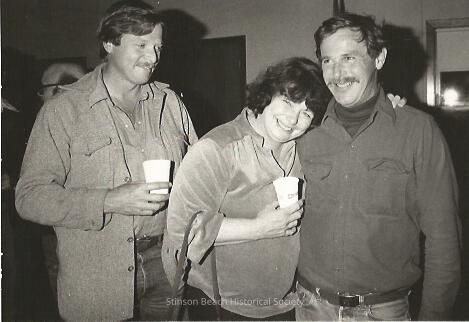 Guests at a party (when Kendrick named Fire Chief?) at the Community Center: Ellie Wikholm rests her head on Kendrick Rand's shoulder while mobile veternarian Ray Dieter looks on. Both she and Ray hold plastic cups and everyone is smiling.Collection