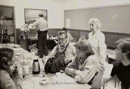 During the storms of '82-83 the community center was set up as a relief area providing food and support to displaced families and disaster workers. Here Mildred Sadler oversees a table at which the Von Kugelgen family, whose house was swept out to sea, is seated. There are many cups, bowls and paper on the table along with a coffee pot. In the background is Dorothy Mayfield and a park ranger looking over another table against the wall.Collection