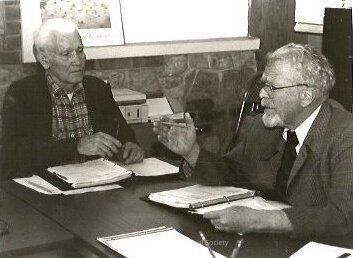 Proctor Jones sits at a table with Gail Bennett in the Water District office, located in the building now occupied by Highway One Realty. Each gentleman has an open notebook in front of them in preparation for a meeting. Behind them is a framed photo of Stinson Beach on a ledge over some brickwork. Both men served on the Water Board in the early 1980s.Collection