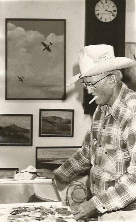 Charles Howard (Howdy) Allen in his cowboy hat and a plaid shirt in his artist's studio in Stinson Beach. Looking down at his work table, he holds a palette in one hand and a painting implement in the other. There are four paintings visible on the wall behind him as well as a grandfather clock. Three of the paintings are landscapes and the topmost is of 2 airplanes flying down through clouds towards earth.Collection
