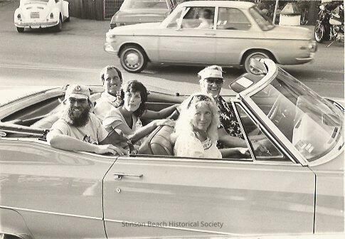 In a classic convertible driven by Steve Lewis with passengers wife Marlis in the front seat, and in the back seat a bearded Bill Stage (L) in cap and Peter Allen (R) with Peter's fiance (and later wife) Rochelle leaning forward between them. Photo taken from Ed's Superette as car passes by on Highway One.Collection