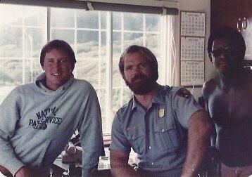 Inside the Stinson Beach Park Life Guard Station. Ranger Terry Swift in uniform is in the center. Pat Norton is on his left in a gray NPS sweatshirt. On is right is an unidentified black lifeguard in sunglasses and swim trunks. The window behind them looks out onto the dunes.Collection
