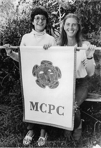 Annie Perry (standing) with an older blond girl, Michelle Roush (seated on a bench), display a Marin County Pony Club banner. They are in the garden of the Perry residence. Annie is wearing beaded moccasins, V-neck sweater over a turtle neck, and glasses.Collection