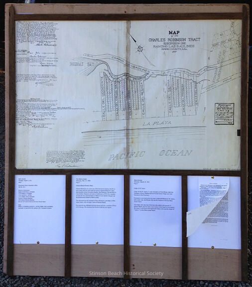 A digital photo of the display board of prepared for the Charles Robinson tract 100th year party showing the history of the subdivision. It included a map of subdivision (see 2014A-100); the a flyer announcing the party held on July 7th 2013 (see 2014A-110-01); Documents filed in Recorder's Office (see 2014A-110-02); Marin Journal obit for Charles Robinson (see 2014A-110-03); Marin Journal obit for Judge Archie Upton (see 2014A-110-04); A copy of Upton Vs. Stinson water right issue(see 2014A-110-05); California Railroad Commission decision to uphold Upton Vs Stinson (see 2014A-110-06)Collection