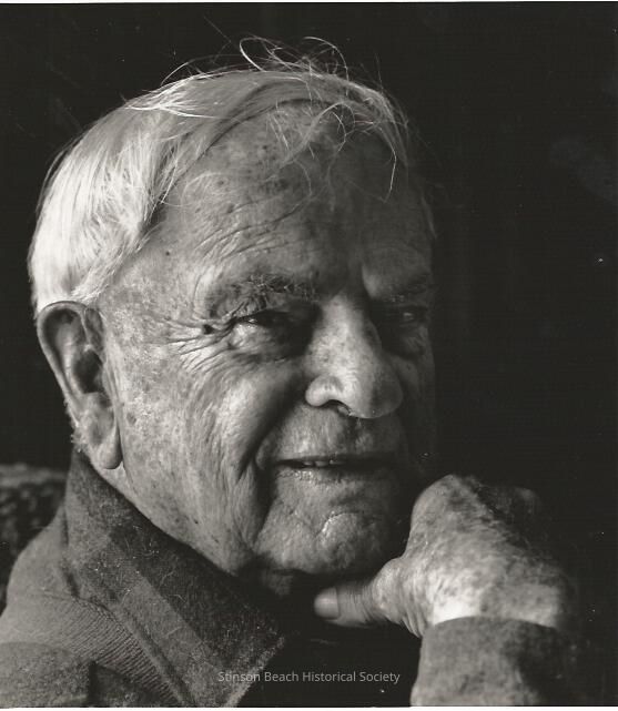 A 3/4 view of an old man in black and white print. This is a portrait of Frenchy Gales when he was about 80 years old. He died in his early 90s. His thin hair is white, he is smiling. His right hand is under his chin half holding his head. He is wearing a woolen lumber-jack type checkered shirts and his suspender on his shoulder is visible.Collection