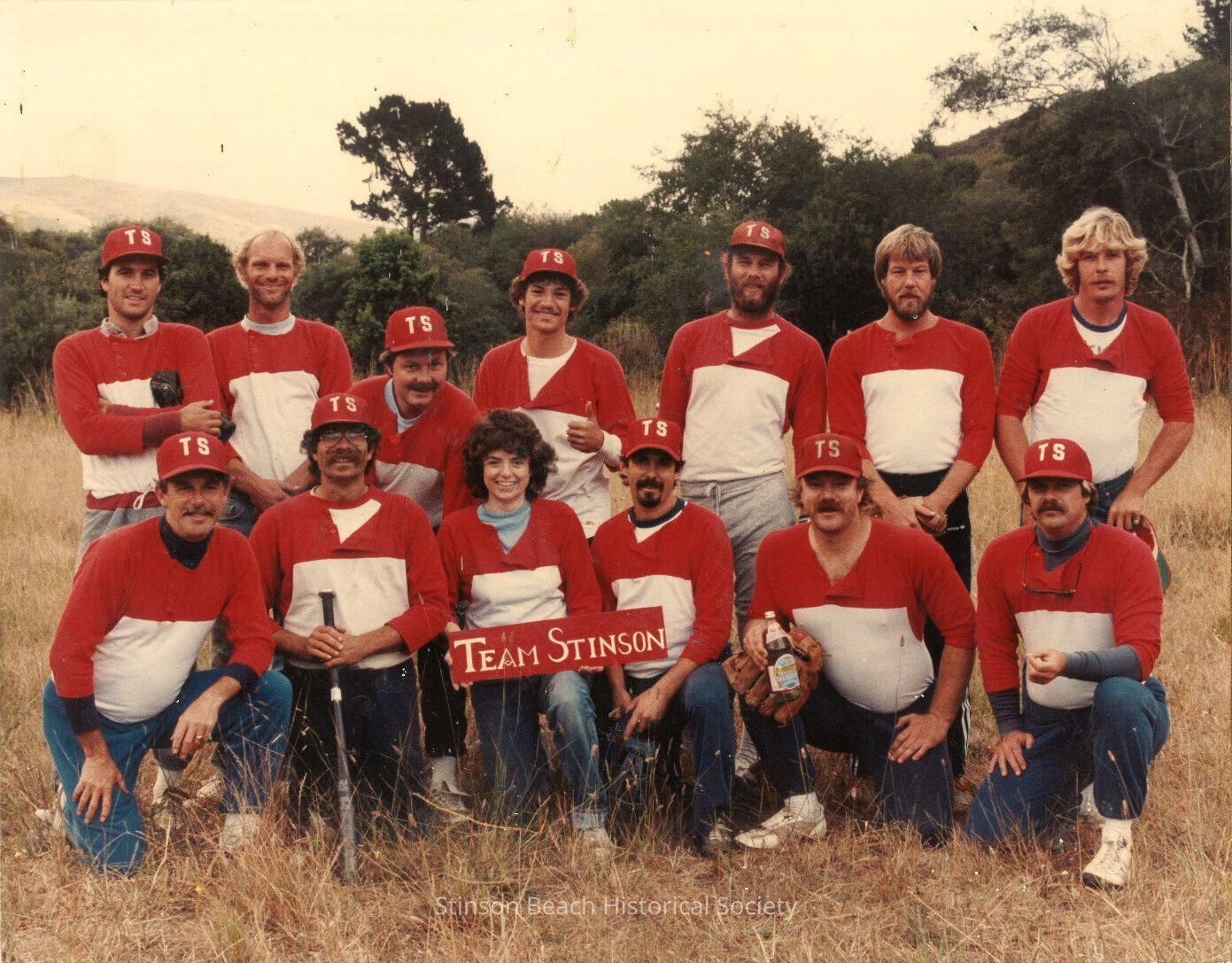 Team Stinson, member of the 1984 West Marin Softball League, assemble on the hillside in Stinson Beach for a group photo. Front Row (L.toR.): Kendrick Rand, Elliott Kolker, Heidi Ryerson [scorekeeper], Larry Robinson, Charlie Lenhoff, George Elwell. Back Row (L.toR.): Bill Scott, Mike Ewell, Mark White, Sean Brennan, Jimi Stafford, Derrill Langer, Phil Bowman.Collection