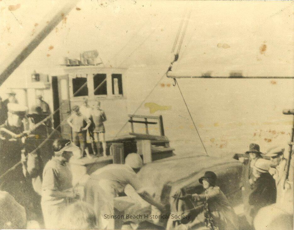 Sailboat launch (or docking) with two women in dark hats aboard being assisted (or being helped on or off the boat) by a women in white. They each have an arm stretched out to the other. Another women wearing a visor looks on. On the dock stand 3 young boys in front of a square boat on which if you look closely can be read "Owl." Bolinas appears very faintly in the back.Collection