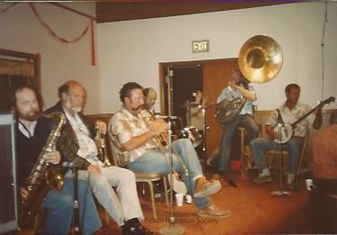 Ben Chollar's All Stars playing a Community Center gig in the 1980s. Ben holds his trombone while the sax player on the left appears to be taking a solo. Pete Allen on banjo sits against the rear wall. Tuba player on a stool next to him is unidentified.Collection