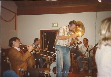 Ben stands while playing the trumpet and Kendrick sits while playing the trombone. Pete is visible in the back playing the banjo.Collection