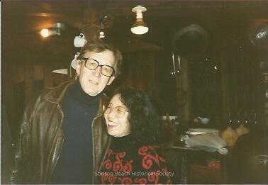 (Artist) Tamae & (Architect) Val Agnoli stand close together in what may be the Sand Dollar. Val has on a leather jacket and black t-shirt and is looking through his glasses as the camera. Tamae, wearing a black & red sweater leans into his shoulder while smiling at someone on the other side.Collection