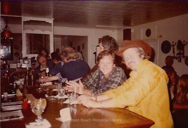 Locals at the Sand Dollar congregate at the bar. John Grissim in yellow windbreaker and brown cowboy hat is foremost. Everyone between and him and Charlie Lenhoff at the far end of the bar are unidentified. John Grissim was a journalist and author who lived and was very active in Stinson cultural activities.Collection