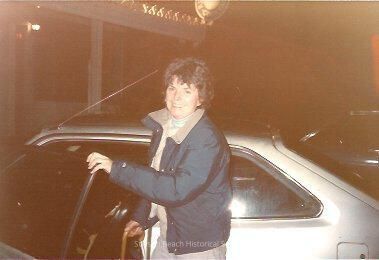 Shirley Sanford prepares to get into her automobile outside the Sand Dollar Restaurant. She is wearing a blue jacket with fur lining and is holding a cane in her right hand, her left is on the open car door window. She was a stained glass artist and had the Black Rock Stained Glass shop at the barn at 3448 Shorline in 1970s.Collection
