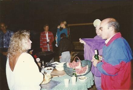Web Otis in a blue & red windbreaker holds a bottle of beer while talking to an unidentified blond in white v-back sweater at an outdoor table which is covered with a green & white checked tablecloth and covered with paper cups and small dishes and green basket. Peggy Pepper, partially obscured, in a lavender poncho stands next to him. Possibly Ginnie Otis in a red plaid jacket stands in the background holding a drink in a white paper cup while the blond woman next to her is raising her drink to her mouth. A boy in a black jacket stands next to her.Collection